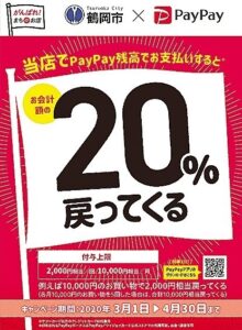 いつもありがとうございます。 明日3/1より始まる「鶴岡市×PayPay 最大20%戻ってくるキャンペーン」 当店も対象店舗となります。テイクアウトも対象となります。 ぜひこの機会にご活用頂き、ご来店ください。